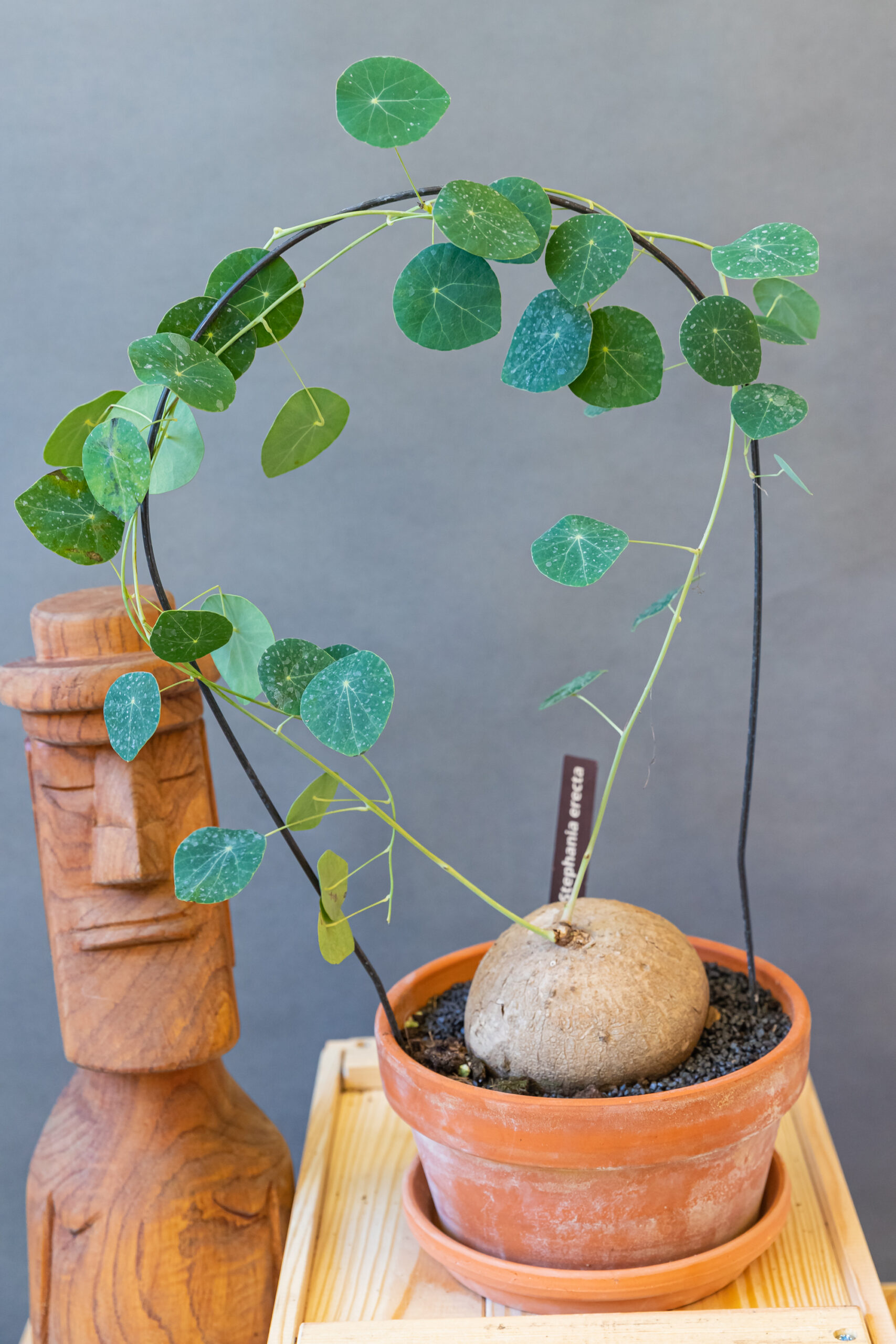 Stephania Erecta 17 cm átmérőjű agyacserépben. A Stephania Erecta az elmúlt évek egyik legfelkapottabb szobanövénye. Thaiföldön őshonos. Burgonyaszerű gumója egész télen szunnyad, de tavasszal hirtelen növekedésnek indul.